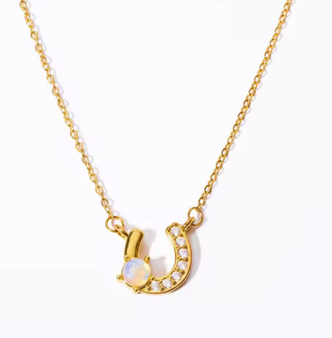 This round Opalite Cabochon 7 lucky number CZ Horse shoe Necklace.