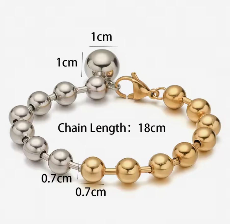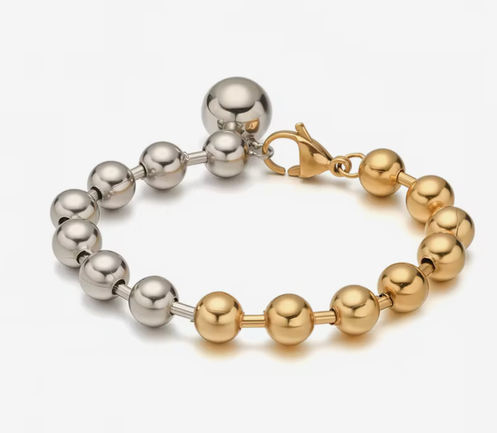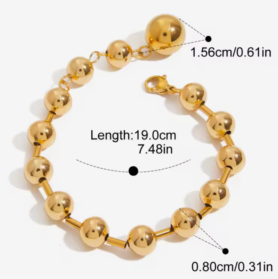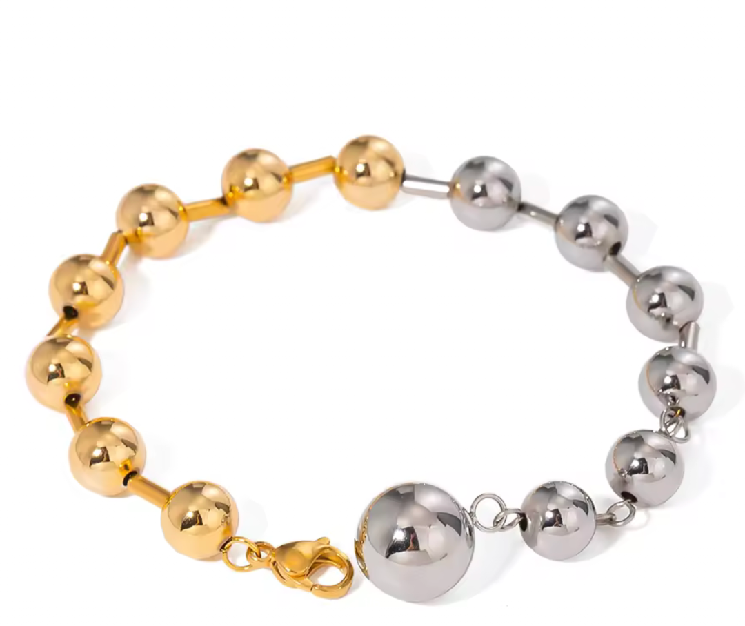 In your Sphere is a mix of our beaded bracelets and a line bracelet. In your sphere mixes the beads and bugle bead. With a large lobster clasp. The beads are stainless steel. Waterproof comfortable