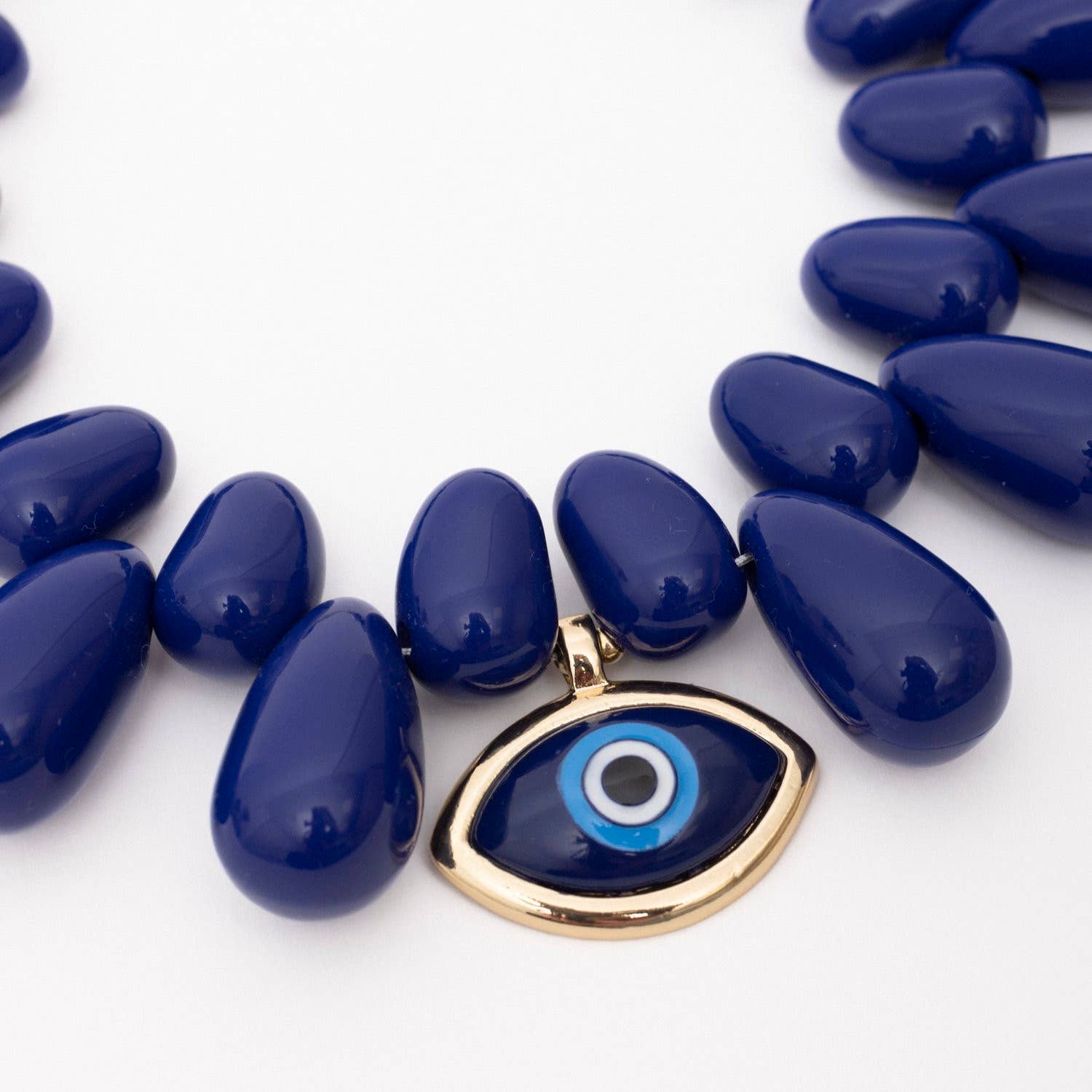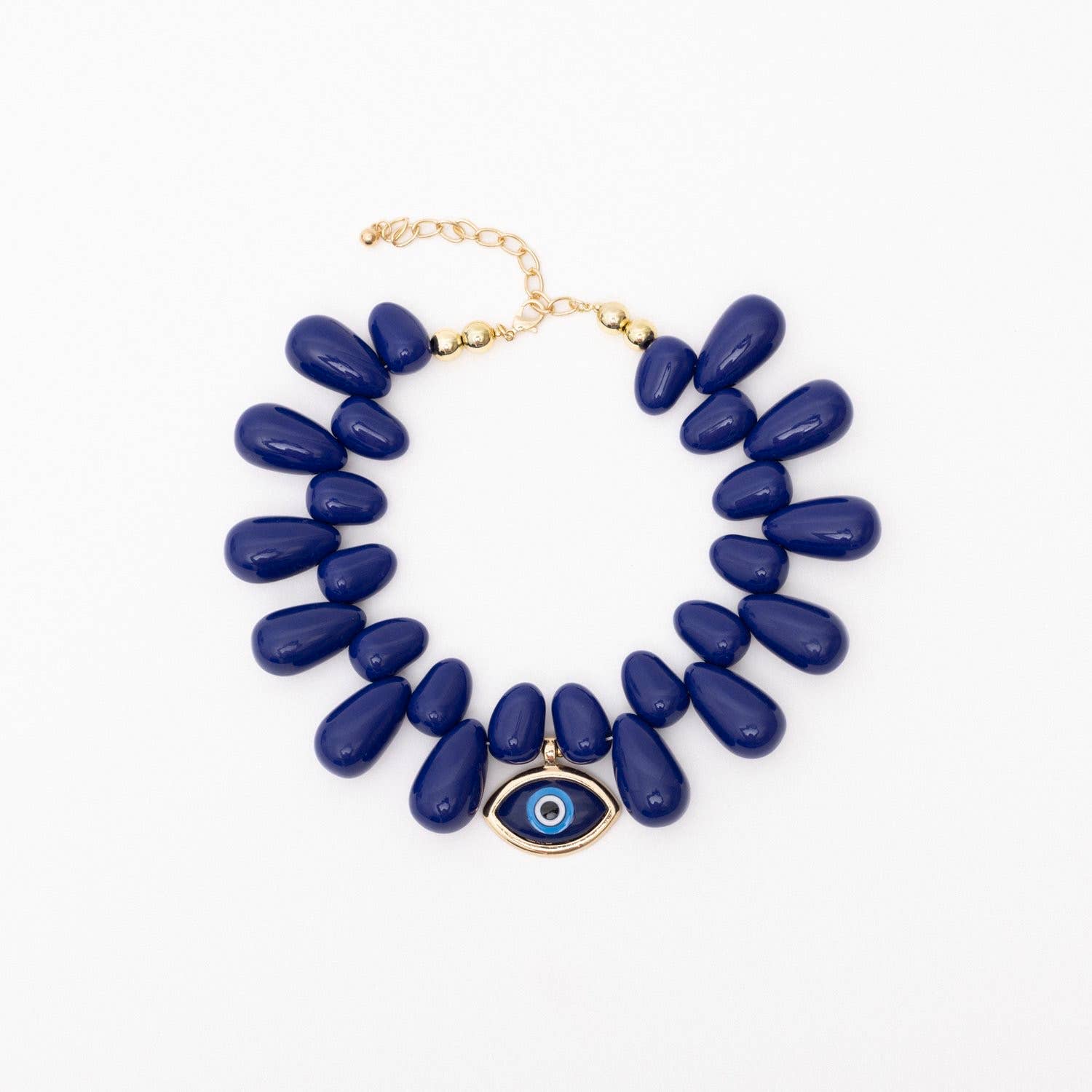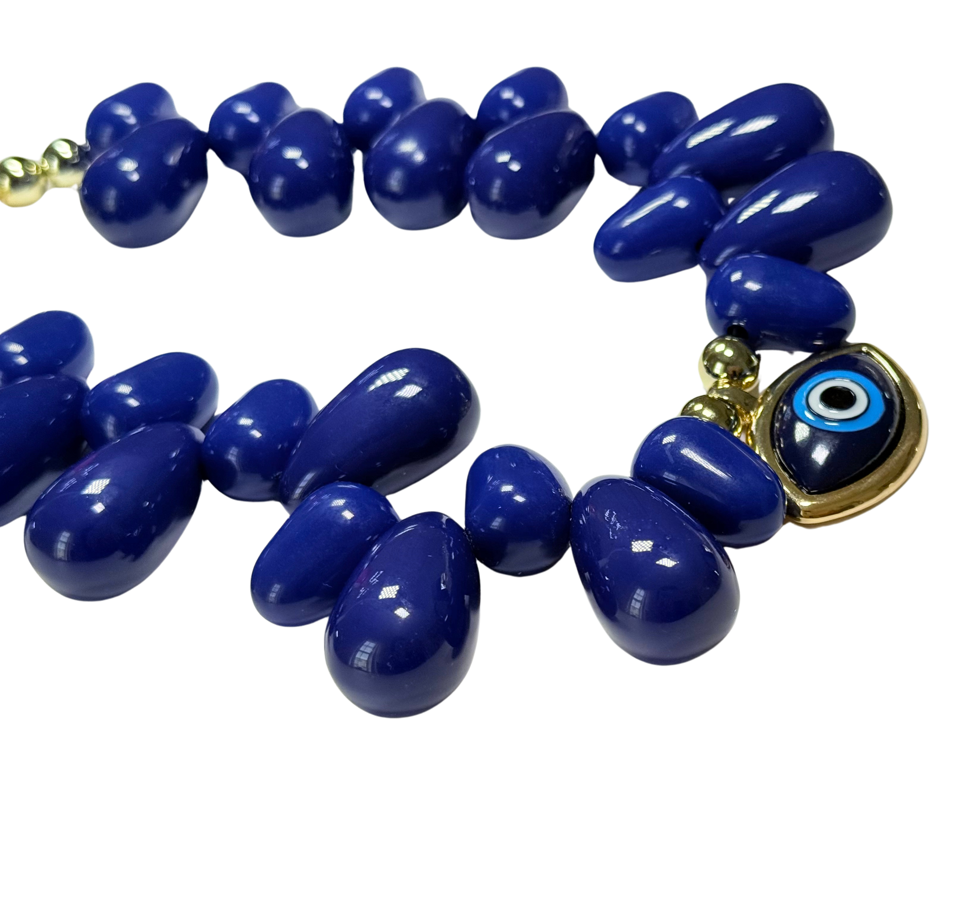 Big Blue Evil Eye is our Newest collar Necklace. With our soft tear drop beads. This necklace is substantial. Large resin beads hand strung to sit like a collar with a blue cabochon style Eye bezel set.