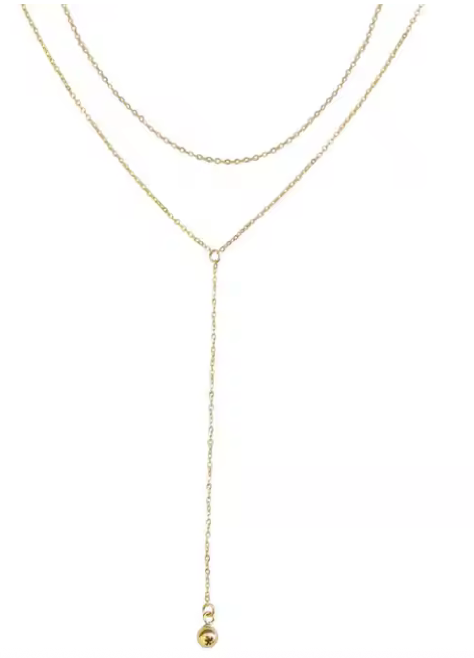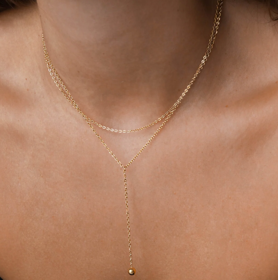 Cantena is a doubled up Necklace in one. The Y lariat and simple curb. The ball pendant allows the ball pendant to move and keep the necklace in place. No clasp in front. No tangle.