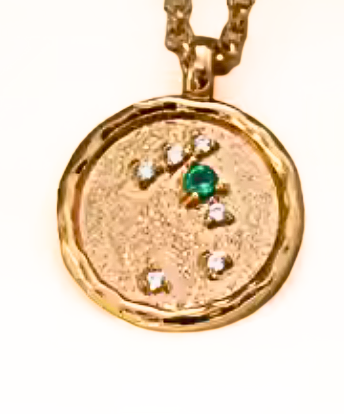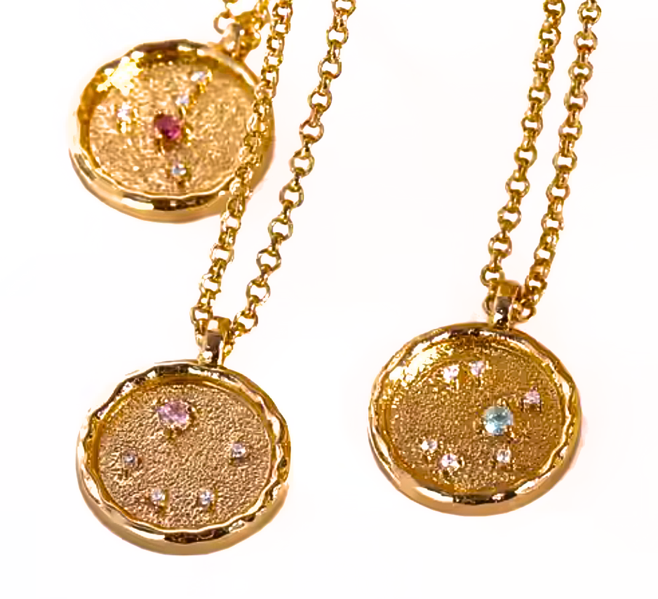 The Zodiac of the celestial make up of the sign for the matching birthstone is laser and hand etched into the pendant. Parts of the plating are matte and parts are shiny gold to ensure a collected and timeless look. Stones are prongs and sit 4 D in the metal. These are very textured.