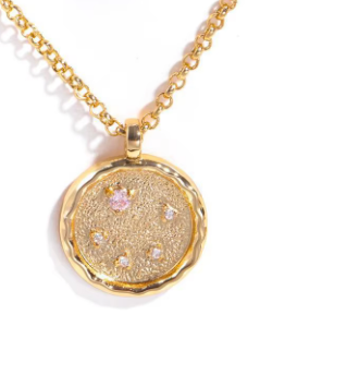 Celestial Zodiac Birthstone Coin Necklace. 14K gold Star Coin Pendant with Wax seal Looking rolled edges. Soft and 4d. The back it foiled so it sits flat like a coin. Each CZ is foil to show through.