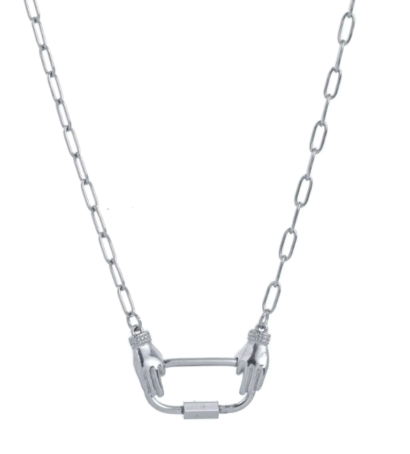 This is all hand cast and assembled. A left and a right hand both in the universal shape of Okay. Wrap around and hold your carabiner. They can be slid off to make a change.