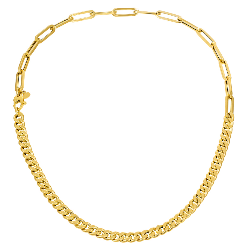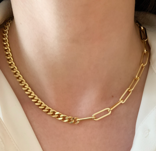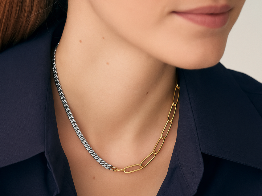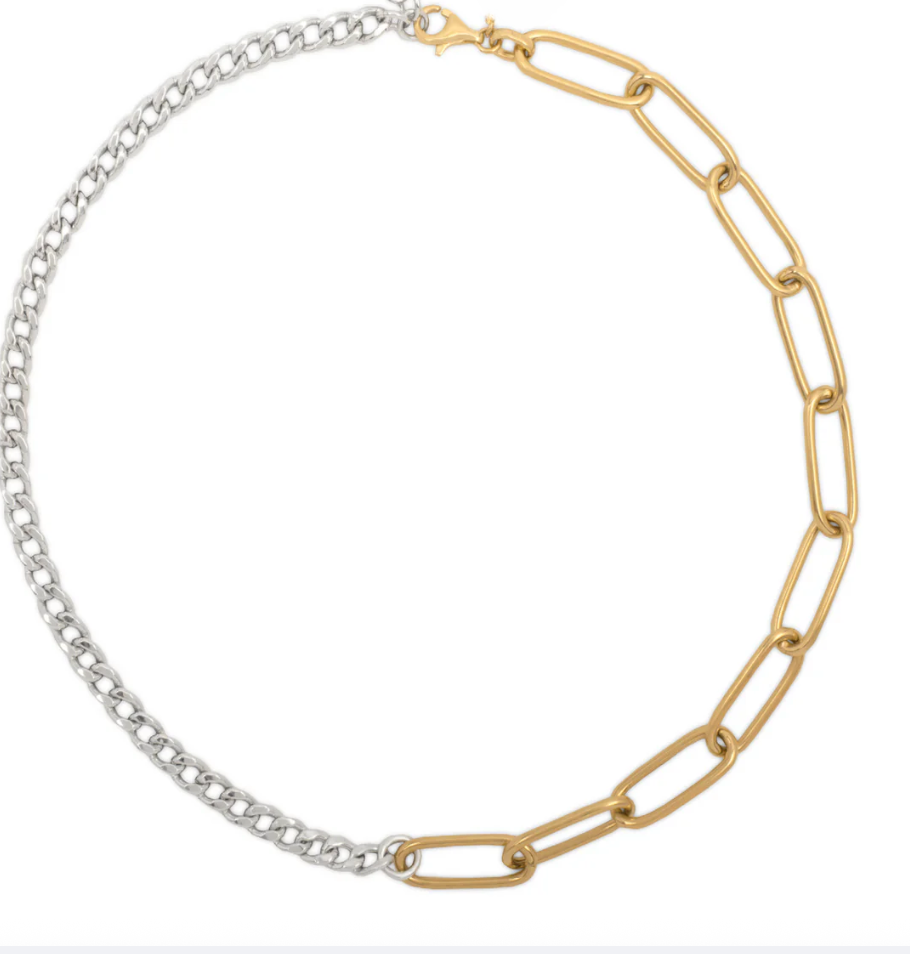 The mix of chain texture and the way the chain lays flat as well at the option to mix the two tones of metals.
