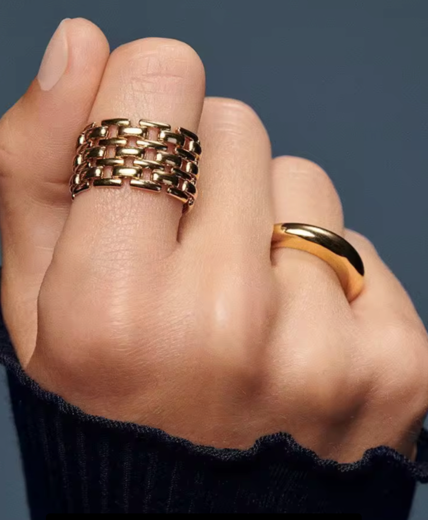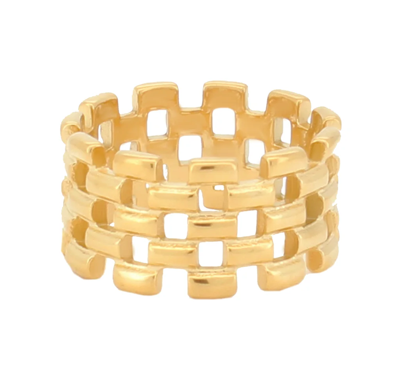 Mosaic is the little tile and watch link band ring. The open nature of the band makes it so comfortable and light weight. A classic style with editorial timing