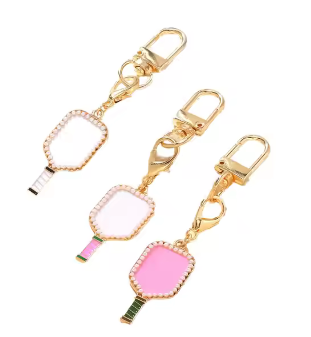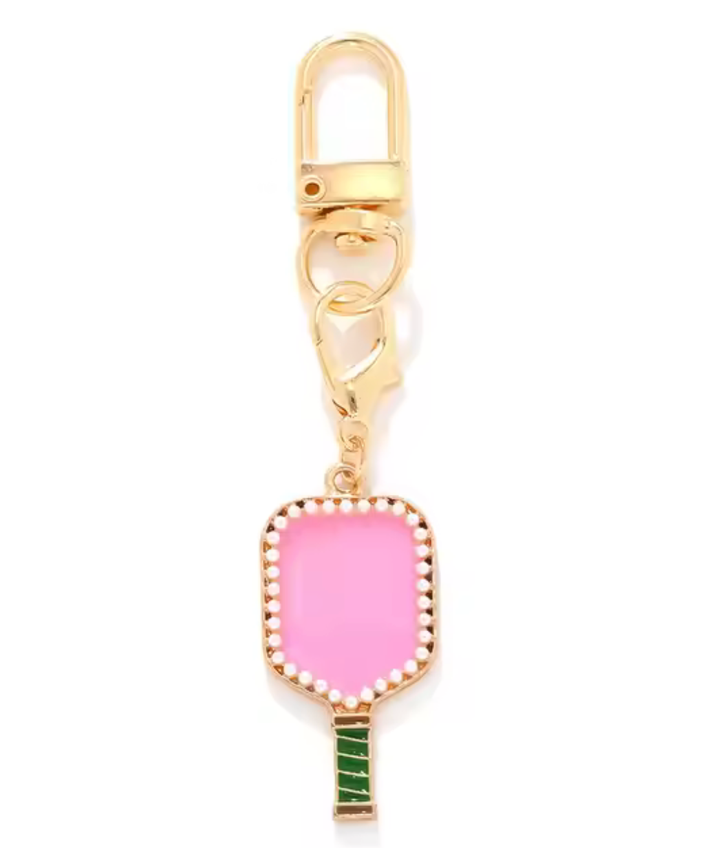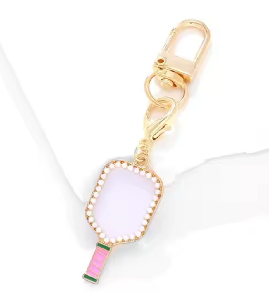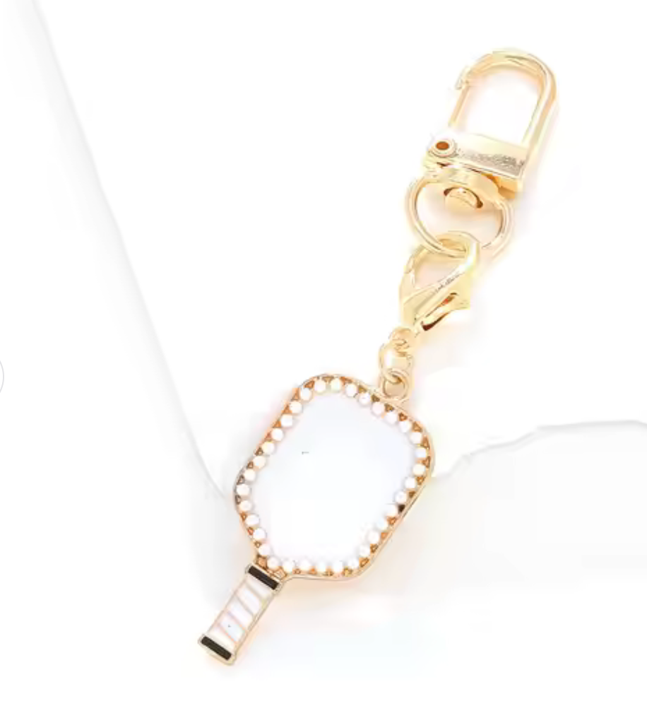 We all love a good sport theme purse charm. They go from our Purse to our gym bag to our Key chain and so much more. These are so cute and fun. Pickle Ball Paddle on brass with hand set mini pearls in a bezel setting. The charm has a lobster to make it easy to move around. Also comes with a large 14K gold swivel clamp.
